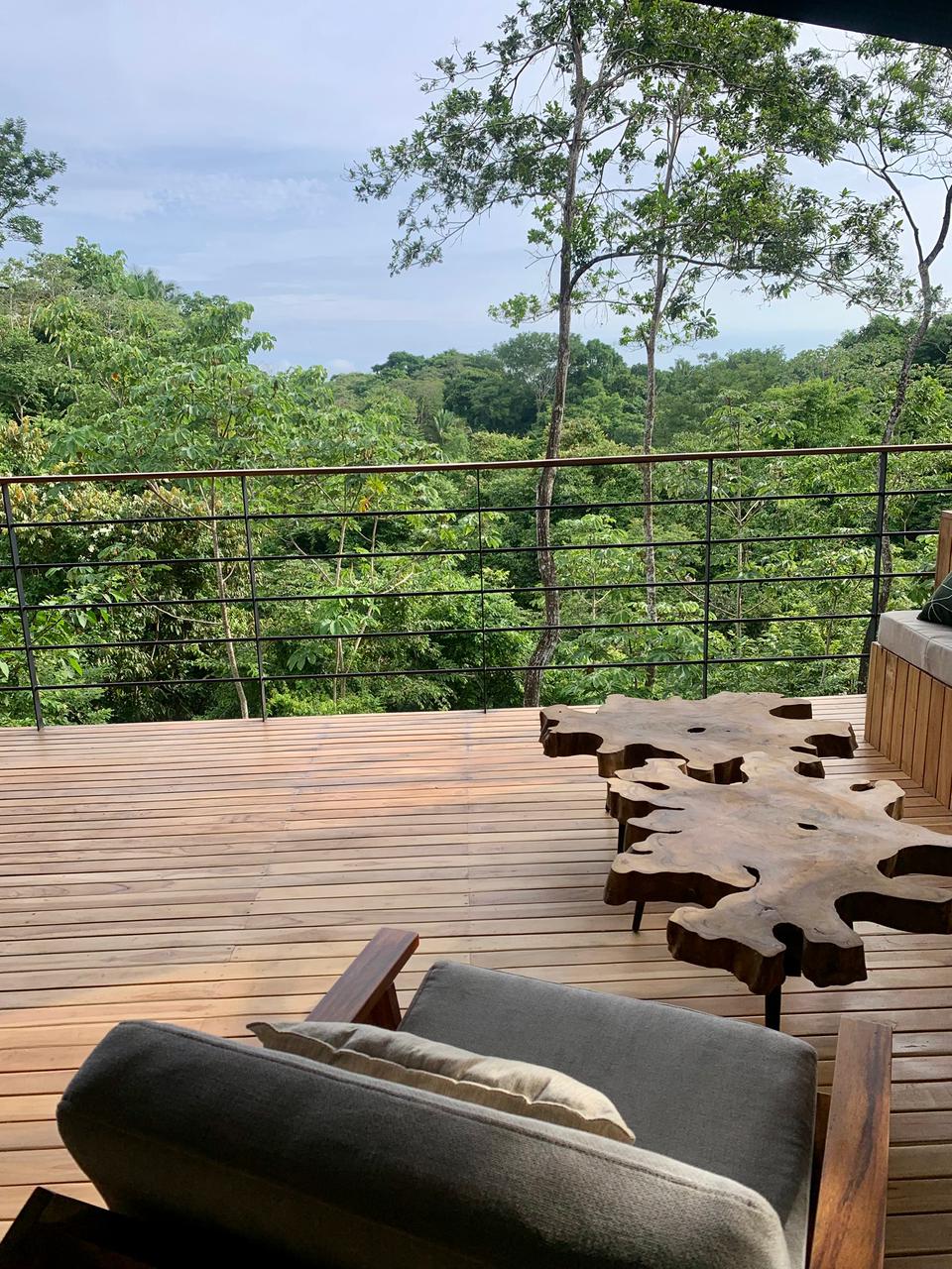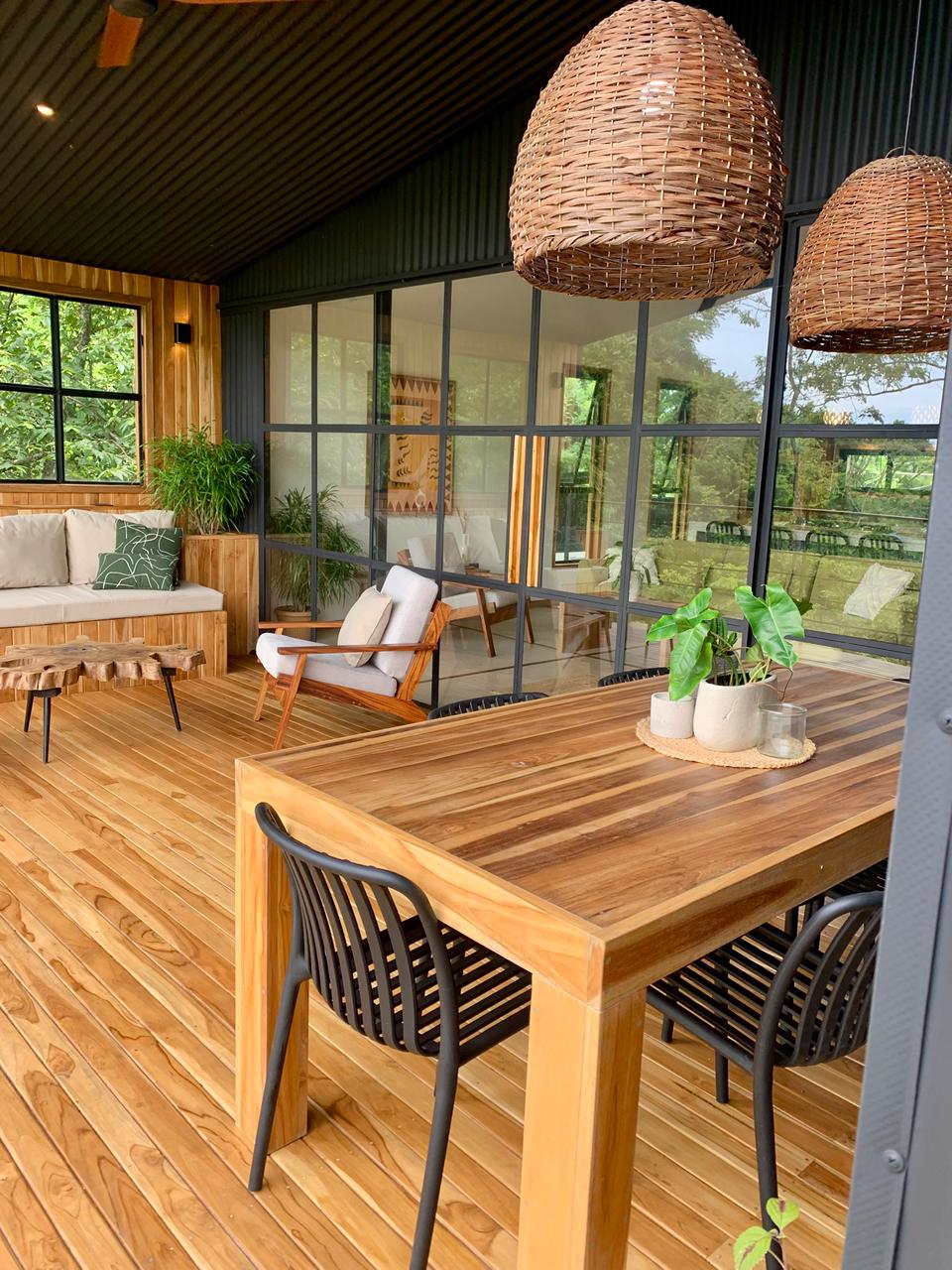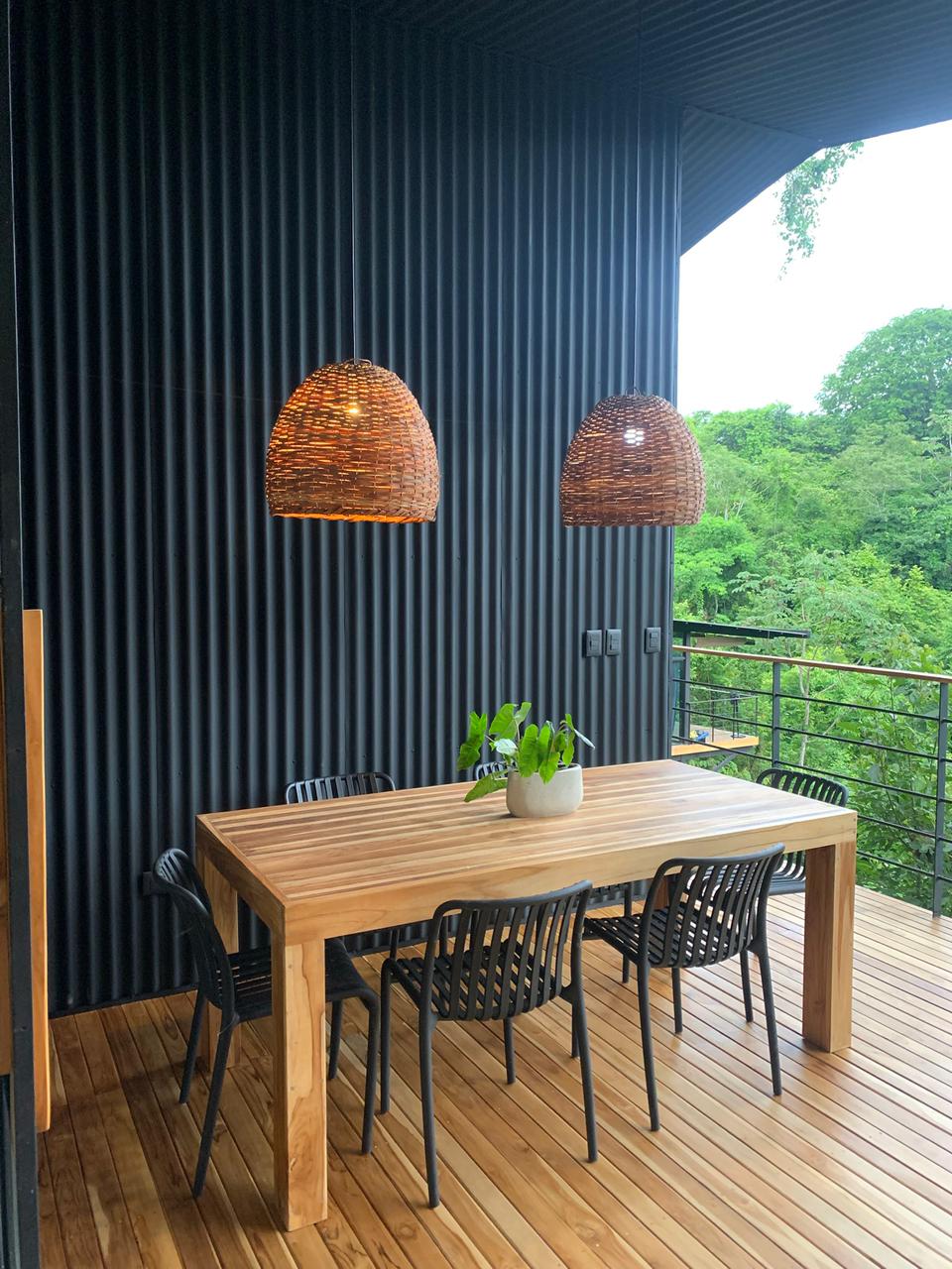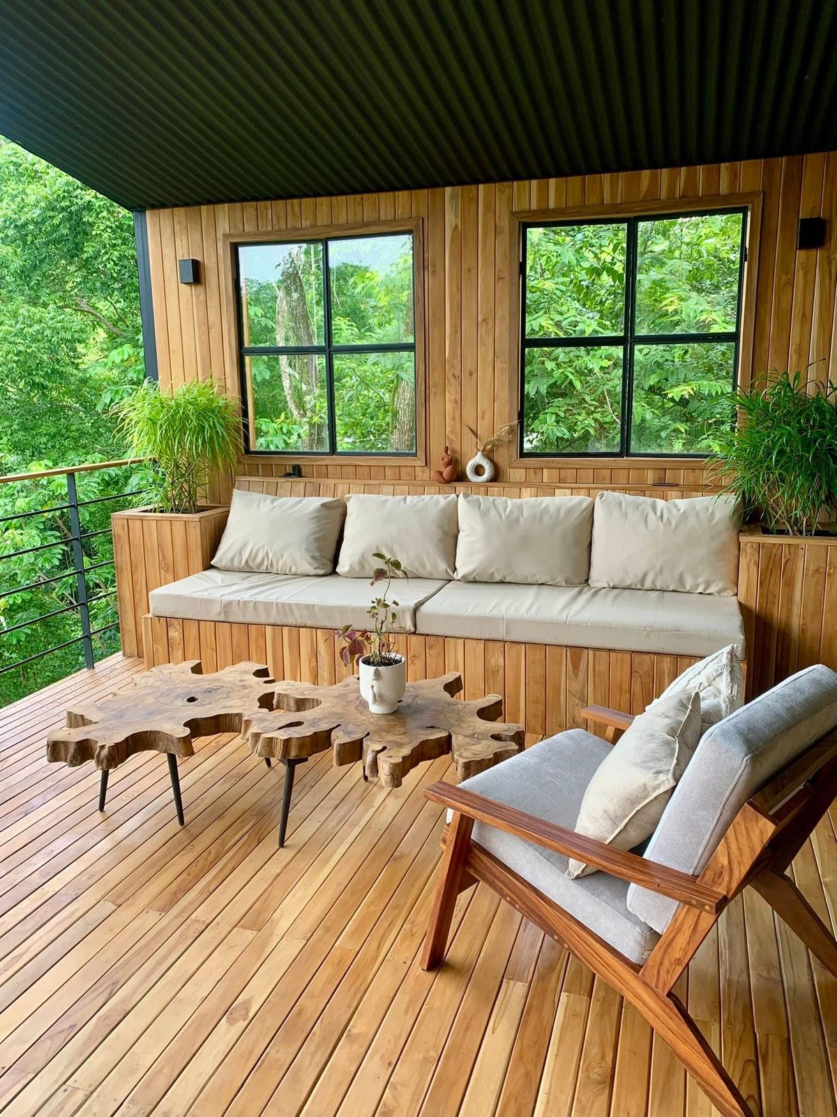 The expansive outdoor deck is designed for relaxation and entertaining, offering a dining table for 6–8 guests, comfortable armchairs, and a chill-out area overlooking the surrounding jungle. The property includes covered parking, two entrances (a main door and a side door connected to the laundry room), and a large garden with plenty of space to add a swimming pool.